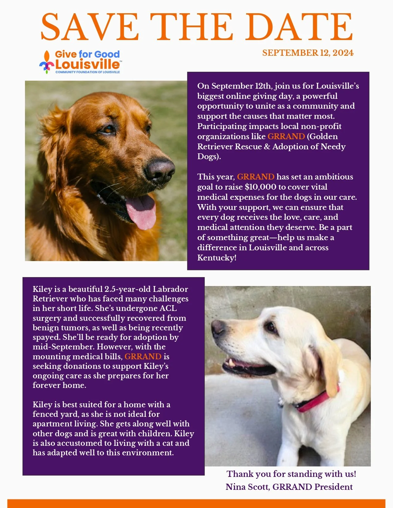 GRRAND is dedicated to rescuing, rehabilitating, and rehoming Golden Retrievers and other dogs in need, focusing on providing them with a safe and loving environment.